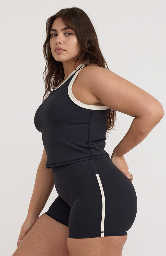 Tolles Tanktop von Organic Basics in Schwarz mit weißen Trägern.Esbesteht aus kompressivem, recyceltem Nylon und eignet sich daher perfekt für hochintensive Sportarten. Tragen Sie es mit den passenden (langen) Sportleggings.