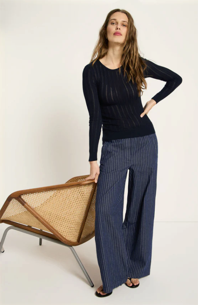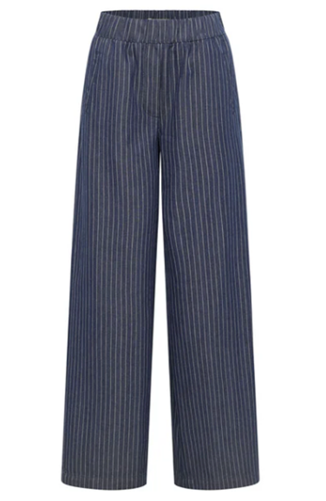 Mooie broek in de kleur navy met witte strepen van het merk Lanius. De broek heeft een wijde pijp, elastiek in de taille en steekzakken aan de zijkanten. Ze heeft een losse, comfortabele pasvorm en is gemaakt van biologisch katoen.