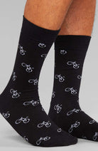 Diese Sigtuna Socken von Dedicated sind schwarz mit einem Allover-Muster aus weißen Fahrrädern auf ihnen. Die Socken sind aus herrlich weicher und bequemer Bio-Baumwolle gefertigt.