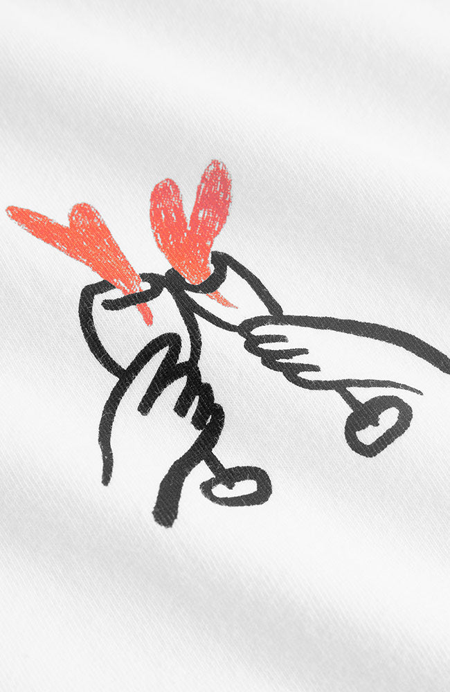 Schönes Basic-Shirt von Dedicated in Weiß mit einem Aufdruck von anstoßenden Gläsern auf der Brust. Das Shirt besteht aus 100 % weicher Bio-Baumwolle und hat eine normale Passform. Das Modell hat angesetzte (nahtlose) Ärmel mit einem gesäumten Rand, was ihr sehr schmeichelt.