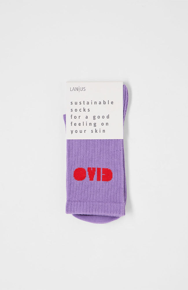 Schöne, weiche, lilafarbene (Sport-)Socken der deutschen Marke Lanius aus GOTS-zertifizierter Bio-Baumwolle mit rotem CIAO-Aufdruck an der Seite.