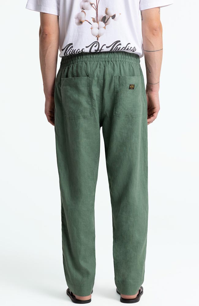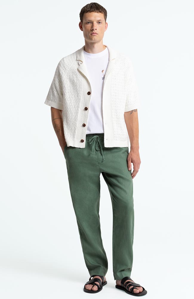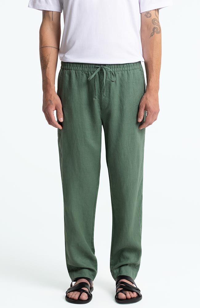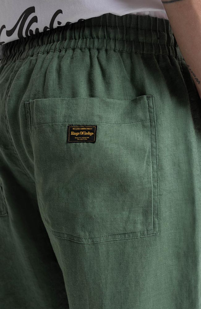 Schöne grüne Leinenhose von Kings of Indigo. Es handelt sich um ein Chino-Modell mit zwei Gesäßtaschen. Die Hose verfügt außerdem über einen elastischen Bund, der mit einem Kordelzug geschlossen wird, und ist wunderbar luftig zu tragen und fällt schön. Die Hose besteht aus 100 % Bio-Leinen.