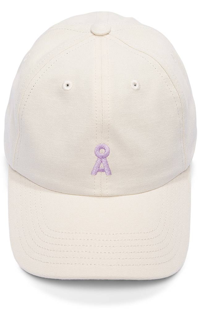 Beigefarbene (mit lila A) Baseballkappe von ARMEDANGELS aus Bio-Baumwolle.