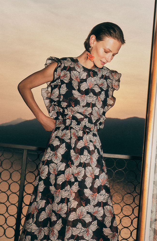 Romantische Bluse von LANIUS mit durchgehendem Blumenprint „Bloom Onyx” in Schwarz, Weiß und einem Hauch Orange. Dieses Modell hat einen runden, hohen Kragen und fröhliche Rüschen an den Ärmeln. Hergestellt aus 100 % GOTS-zertifizierter Bio-Baumwolle. Schön zu kombinieren mit dem passenden Midirock!