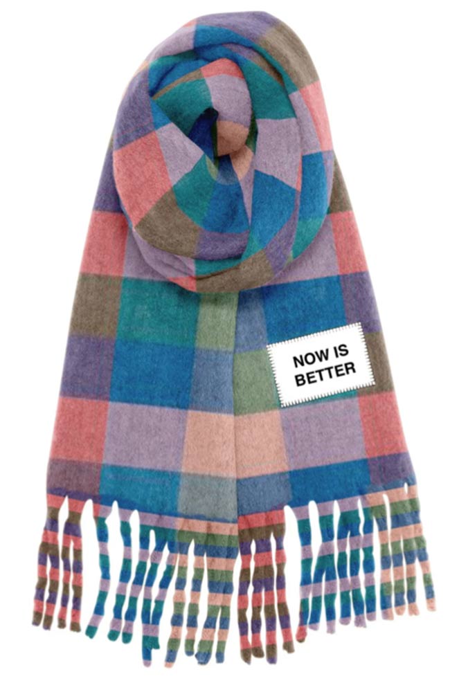Leuke sjaal van het merk VERB TO DO met ruiten in verschillende kleurtjes en de tekst 'now is better'. Ze is gemaakt van 100% post-consumer gerecyclede materialen (Repreve) en haar afmeting is 185x30 cm (360gram).