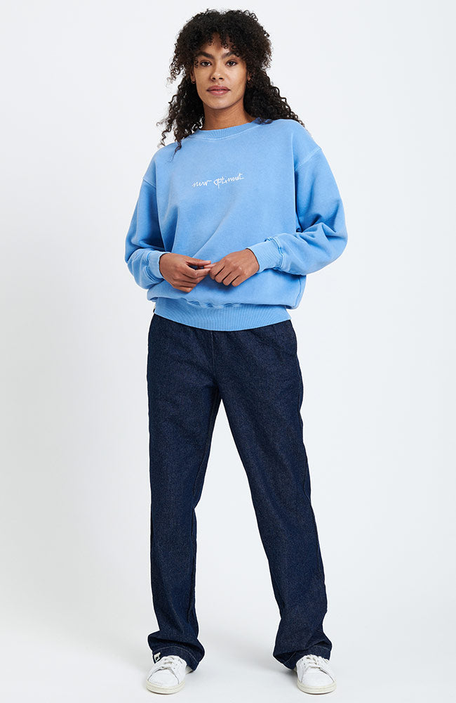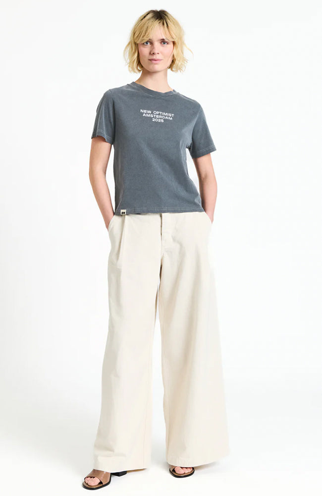 NEW OPTIMIST verwendet hauptsächlich das Material Bio-Baumwolle. Sowohl für Sweatshirts, T-Shirts und Jeans. Sie produzieren nur kleine Mengen, die zur Wiederverwendung bestimmt sind. Alle Artikel sind handgefertigt und werden in Amsterdam zusammengesetzt. Außerdem haben alle Produkte eine lebenslange Reparaturgarantie.