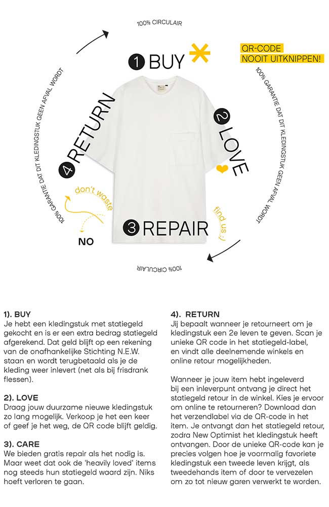 Gerade jetzt (August 2023) startet die Marke ihr neues Einlagenprogramm. Wie genau funktioniert das? Sie lieben Mode, wollen aber nicht zu dem großen Problem des Textilabfalls beitragen. Deshalb führt New Optimist in dieser Wintersaison Pfand auf Kleidung ein . Dazu werden QR-Codes in den Kleidungsstücken und die Blockchain-Technologie geschickt eingesetzt. Diese Plattform wurde in Zusammenarbeit mit Candour Digital entwickelt. Dies ermöglicht es uns, Ihr New Optimist-Kleidungsstück selbst abzuholen, wenn Sie es nicht mehr benutzen. So garantiert New Optimist, dass Ihr Kleidungsstück irgendwann recycelt wird oder ein zweites Leben erhält. KEIN ABFALL! Ein Kleidungsstück mit Pfand macht den Kreislauf der Mode zu 100% rund. Über den QR-Code können Sie den gesamten Lebenszyklus des Kleidungsstücks bis hin zum Recycling verfolgen. Zeigen Sie allen, dass Kleidung nicht im Abfall landen muss.
