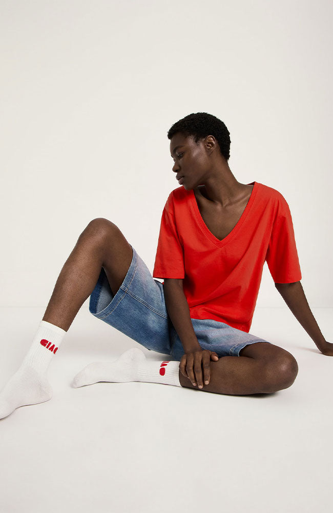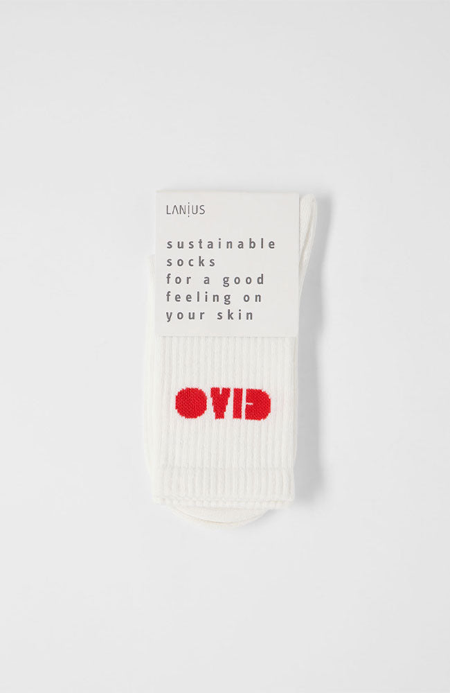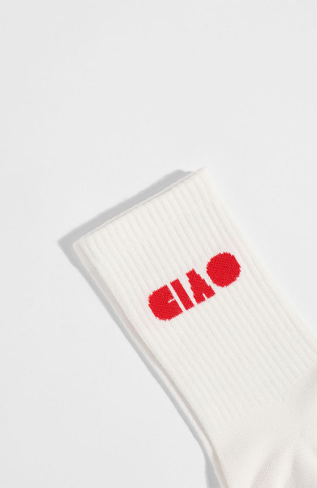 Schöne cremefarbene (Sport-)Socken der deutschen Marke Lanius aus GOTS-Bio-Baumwolle mit rotem CIAO-Aufdruck an der Seite.